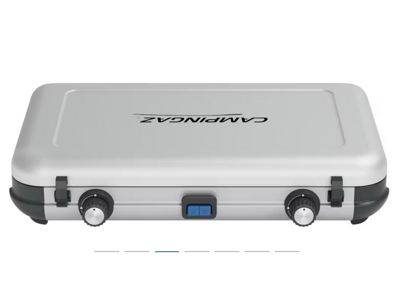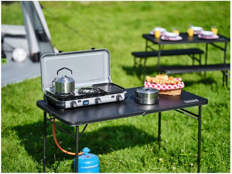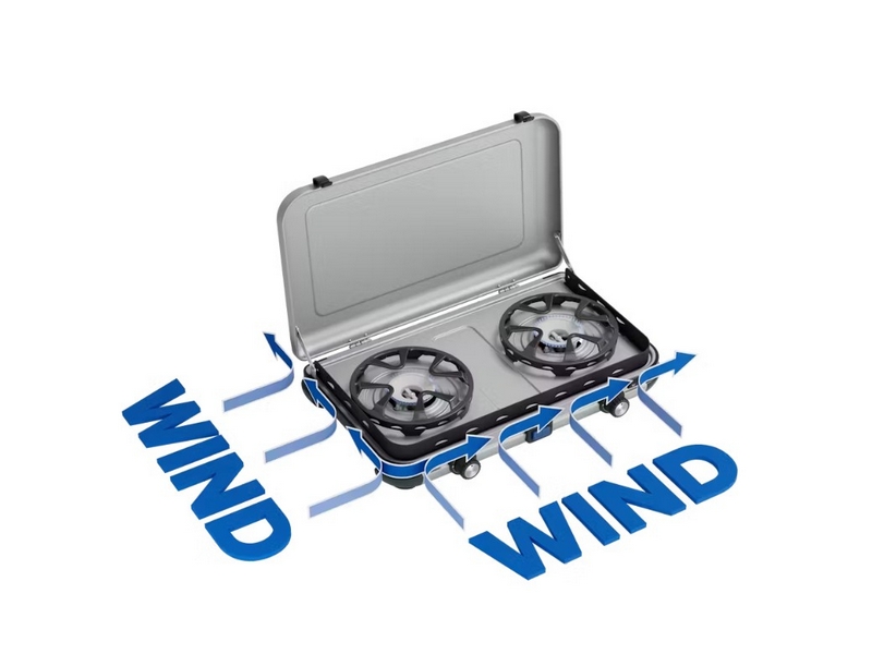 Het Camping Kitchen 2 Maxi-kooktoestel heeft twee onafhankelijke branders zodat je de twee pitten los van elkaar kunt afstellen. Wanneer je voor grotere gezinnen of groepen kookt, kun je op de grootste pit een pan tot 28 cm gebruiken, zodat je de flexibiliteit hebt om de potten en pannen uit je eigen keuken te gebruiken. Ook wanneer het weer onvoorspelbaar is, beschermt de FLAMEGUARD-technologie van de branders de vlammen optimaal, zodat je ook buiten gewoon kunt koken. Het deksel is met verstevigde scharnieren op de basis gemonteerd en het volledige kooktoestel gaat zo in de koffer, zodat je het toestel voor en na je kampeervakantie heel eenvoudig schoon kunt meenemen. De pannendragers kunnen worden verwijderd, voor gemakkelijk schoonmaken op de camping.