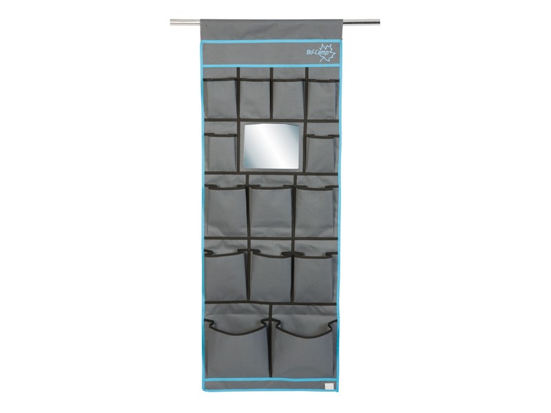 Beschrijving Een multifunctionele 14-vaks organizer met spiegel. Gemaakt van een hoge kwaliteit Two-Tone 600D Oxford Polyester. Beschikt over 2 ruime vakken, 6 medium vakken, 6 kleine vakken en een spiegel. Eenvoudig en op diverse manieren te bevestigen. Zo kan dit tentschort met de pees worden opgehangen aan een caravanrails, met het klittenband aan een tentstok of met de zeilogen aan haken. De lussen onderaan zorgen voor extra fixatie.