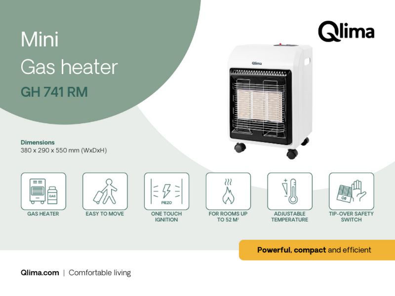 Klein maar fijn! Dat is de GH 741 RM gaskachel van Qlima. Met deze compacte maar krachtige gaskachel is comfortabele warmte altijd binnen handbereik. Perfect voor gebruik op de camping, in de werkplaats of op een frisse thuiswerkdag. Je hoeft bovendien niet lang te wachten op de gewenste temperatuur, want de GH 741 RM zorgt direct voor aangename warmte. En dankzij de handige wielen verplaats je de kachel gemakkelijk naar elke gewenste ruimte.