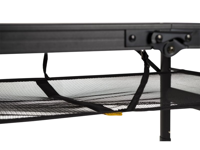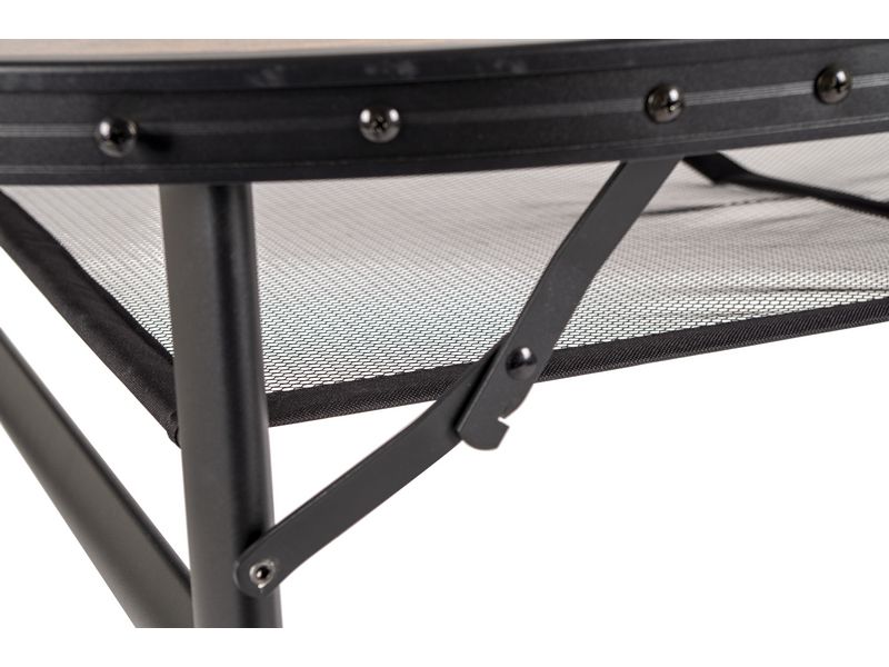 Een stijlvolle aluminium tafel met een industriële uitstraling en houtlook tafelblad. Door middel van stelschroeven zijn de tafelpoten af te stellen op een ongelijke ondergrond. De poten zijn in 2 verschillende hoogtes verstelbaar (37/70). Daarnaast is de tafel zeer compact als koffermodel op te bergen door de afneembare poten en een deelbaar blad. Bovendien is de tafel voorzien van een net onder het MDF tafelblad om spullen in op te bergen, en een handgreep waardoor de tafel gemakkelijk is mee te nemen. Ingeklapt (lxbxh): 80x7x60,5 cm.