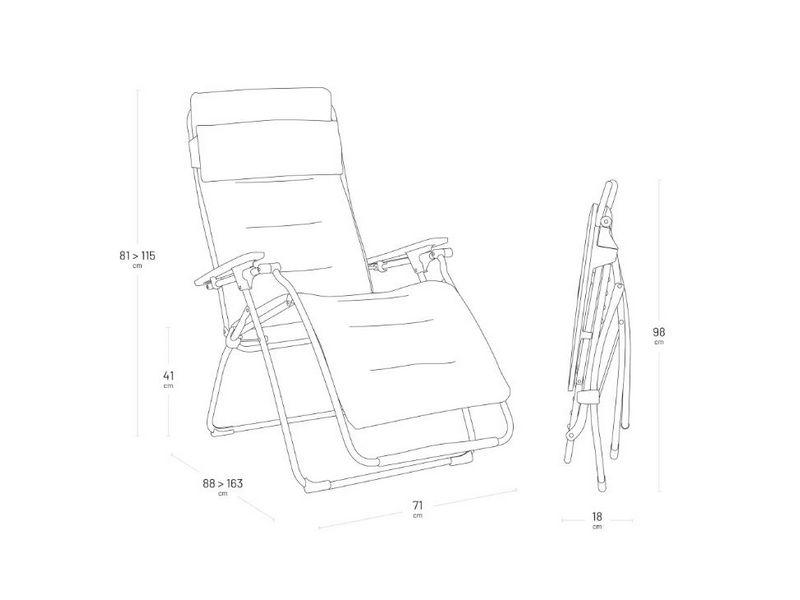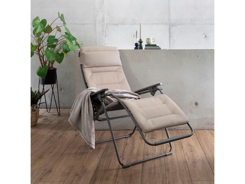 Beschrijving De gepolsterde uitvoering van de relaxstoel FUTURA biedt zowel binnen- als buitenhuis heerlijk zitcomfort. Dit model is dé referentie op het gebied van ontspanning en is ontworpen om u een stoel met ideale relaxpositie te bieden in een opvouwbaar formaat. Het essentiële pluspunt is de positie waarbij de benen iets hoger liggen dan het hart, wat de optimale rustpositie is. Een must have om te ontspannen op de veranda, in de tuin of gewoon in huis.