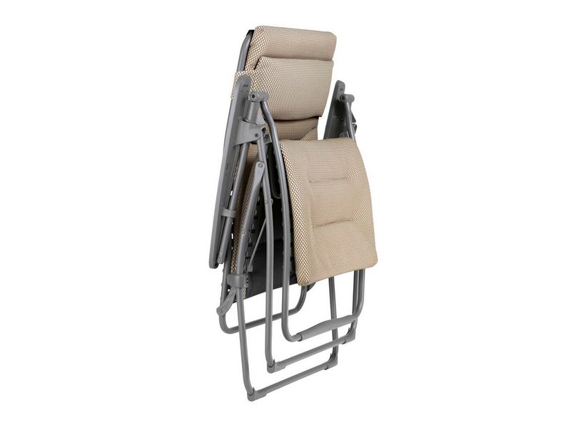 Gepolsterd doek: BeComfort®, luchtdoorlatende kussens met drie-lagentechniek. Afneembaar en vervangbaar doek, bevestiging via clips van elastomeer (LAFUMA MOBILIER-gepatenteerd).
