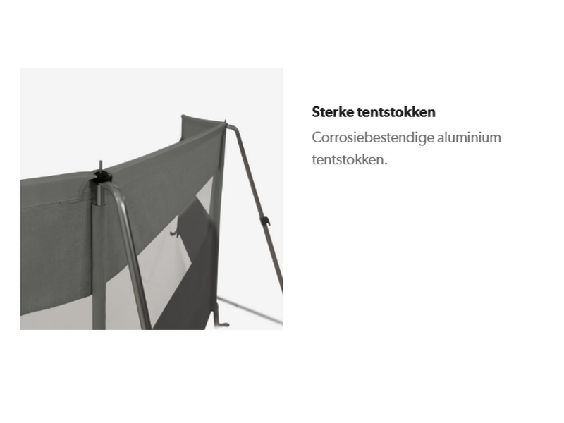 Het windscherm met tentstokken is de perfecte aanvulling op je voortent. Snel te installeren en ondersteund met verstelbare ondersteuningsstangen. Het frame ervan is volledig van aluminium, licht van gewicht en corrosiebestendig.