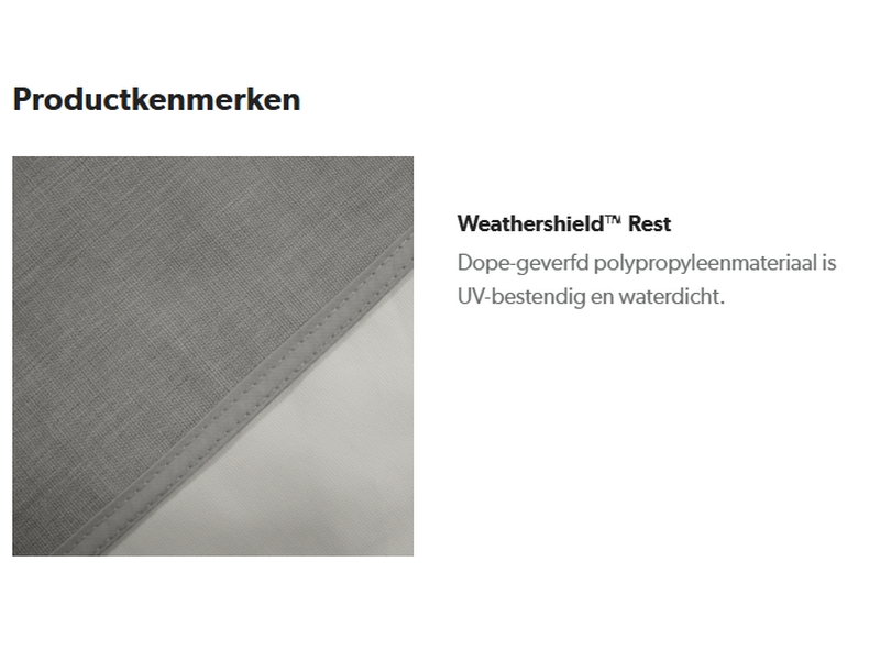"Een primeur van Dometic is onze nieuwe Weathershield™ Rest, gemaakt van 100% polypropyleen stof, die uitstekend comfort en bescherming tegen weersinvloeden biedt. Het materiaal is niet alleen volledig waterdicht, maar ook van nature water- en vuilafstotend, waardoor het eenvoudig te reinigen is. Door het lichte gewicht is dit materiaal gemakkelijk te hanteren, op te zetten en af te spannen. Dope dyeing zorgt
