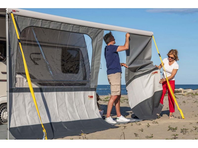 Beschrijving Fiamma voorwanden bieden gemakkelijke toegang tot het schaduwrijke gedeelte van de luifel en zorgen voor extra bescherming.