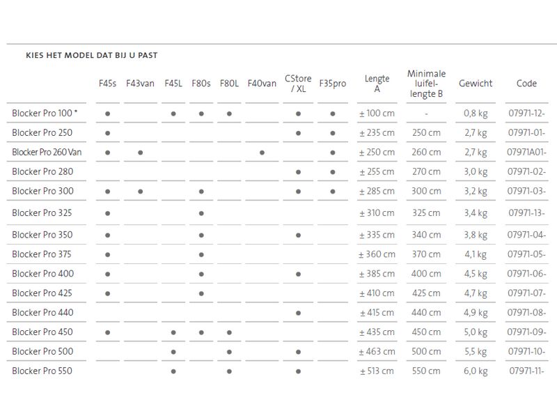 Geschikt voor Fiamma luifels: F45S, F45L, F65S, F65L, F70, F80S, F80L.