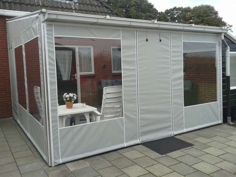 De panelen zijn horizontaal en verticaal bevestigd met rail en pees. Op de middenpalen zijn tourniquets bevestigd, zodat het doek strak blijft, en dicht bij de palen blijft. Doordat de veranda aan de voorzijde is voorzien van een regengoot, zijn de panelen aan de binnenkant bevestigd. De onderzijde is bevestigd met elastieken en verzwaard met een RVS stang. De panelen zijn allen afzonderlijk oprolbaar en weghaalbaar.