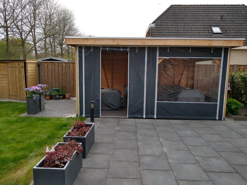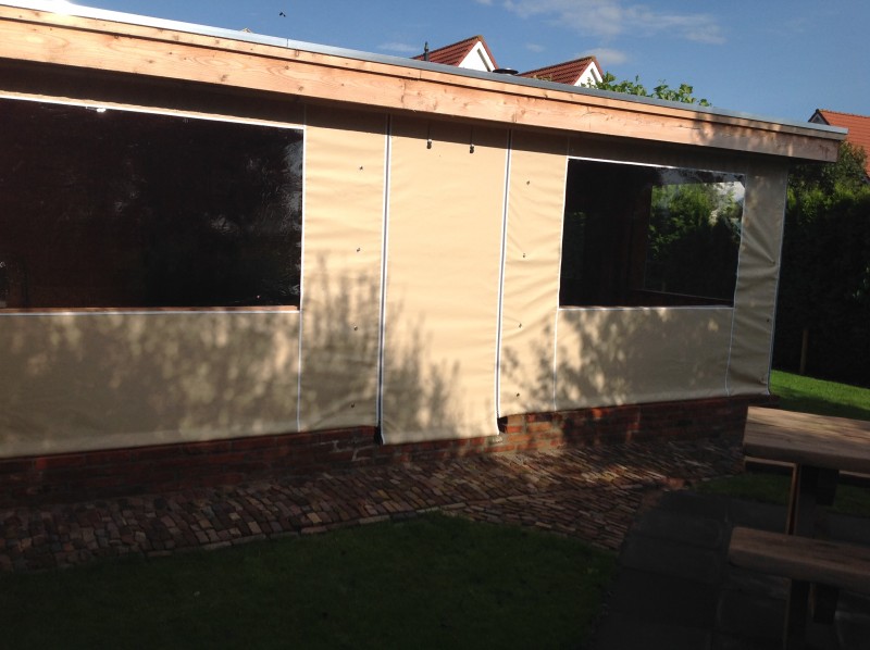 Naast de deur, op de hoeken, en op de midden palen, ziet u vertikaal een aantal bevestigings punten gemaakt. Dit is bedoeld om het doek strak op het hout te houden als de deur, en of panelen veel open is/zijn.