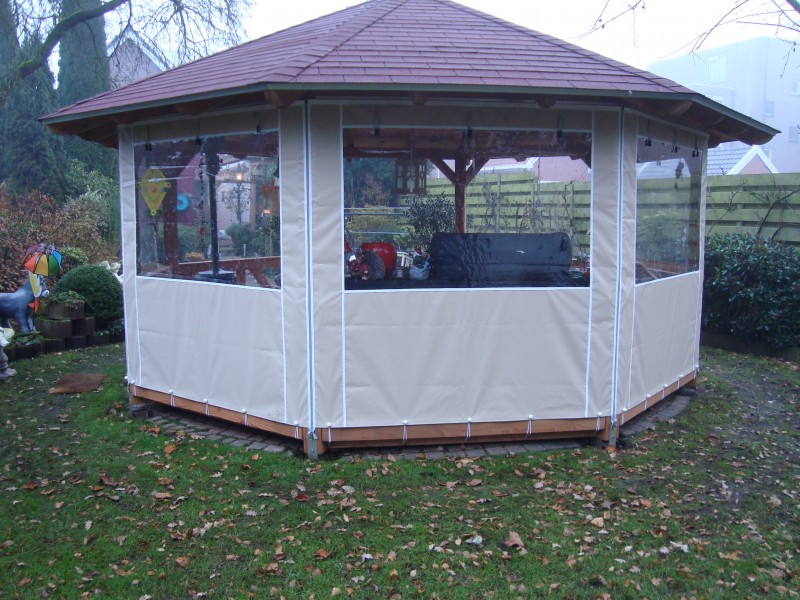 Voor deze houten 8-kantige tuinhuis hebben we een complete ombouw gemaakt (er ontbreken op de foto 3 panelen).
