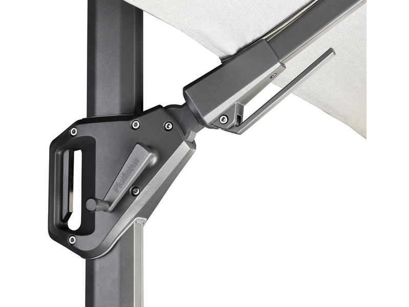 Dubbel kantelbare zweefparasol. 360 graden draaibaar. Uitgevoerd in spuncrylic.