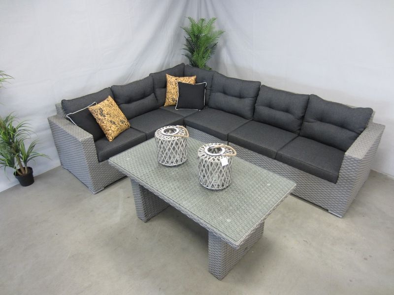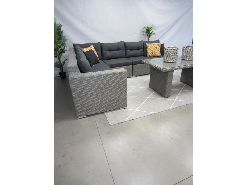 De 5-delige Palermo hoek-lounge-set is gemaakt van een aluminium frame met daar omheen een 15 mm halfrond-plat vlechtwerkdraad in de kleur grey inclusief antracietkleurige zit- en rug kussens. Deze hoek-lounge-set met een totale afmeting van 230 x 305 cm bestaat uit twee bankelementen en een loungetafel van 145 x 85 x H66,5 cm. De loungetafel-diningtafel is voorzien van een glasplaat.