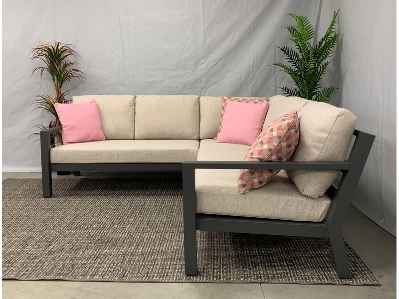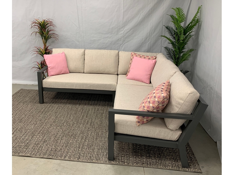 De Brooks aluminium hoek-lounge set is gemaakt van een aluminium frame. Het zitgedeelte is gemaakt van textileen,en het ruggedeelte is uitgevoerd met dikke aluminium buizen. De set heeft een stoere uitstraling. Deze lounge set wordt uiteraard geleverd inclusief vuil- en waterafstotende kussens. Deze hoek-lounge-set bestaat uit twee 2 2-zits lounge-banken en een corner. De totale afmeting van de set is 220 x 220 cm.
