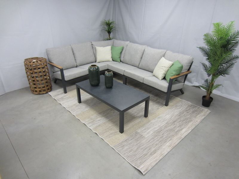 Beschrijving De 4-delige Paleros hoek-lounge set is gemaakt van een aluminium frame. De zitting en rugleuning zijn bekleed met aluminium latten. De armleuningen zijn afgewerkt met teakhout. De set wordt geleverd inclusief zit- en rug kussens. Deze hoek-lounge-set bestaat uit twee 2 2-zits lounge-banken, een corner deel en een centerdeel. De totale afmeting van de set is 215 x 275 cm.