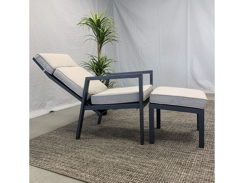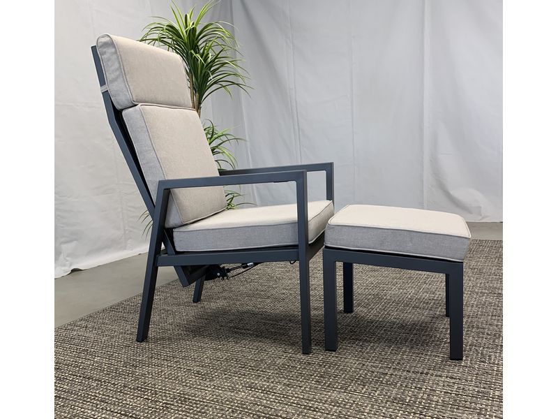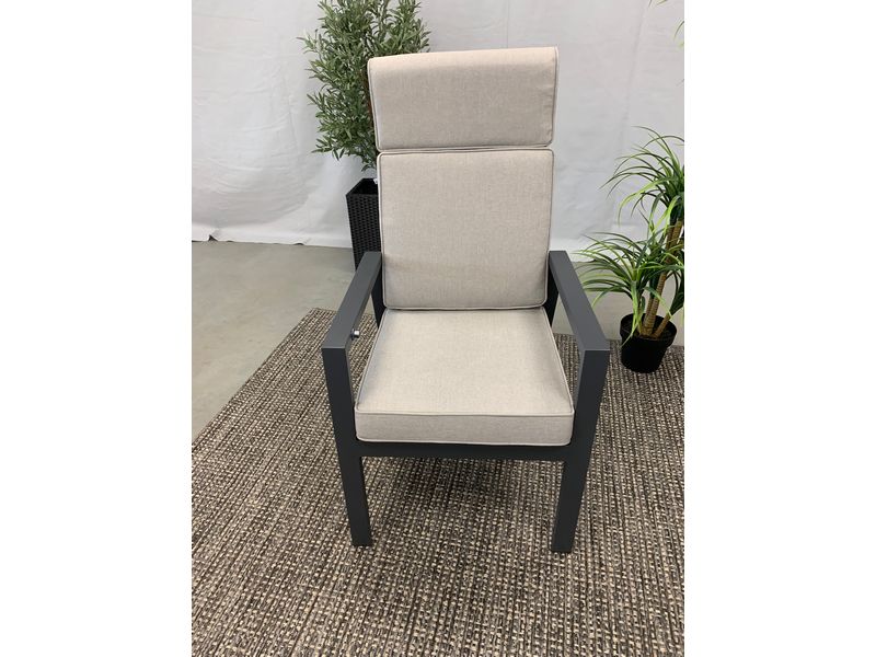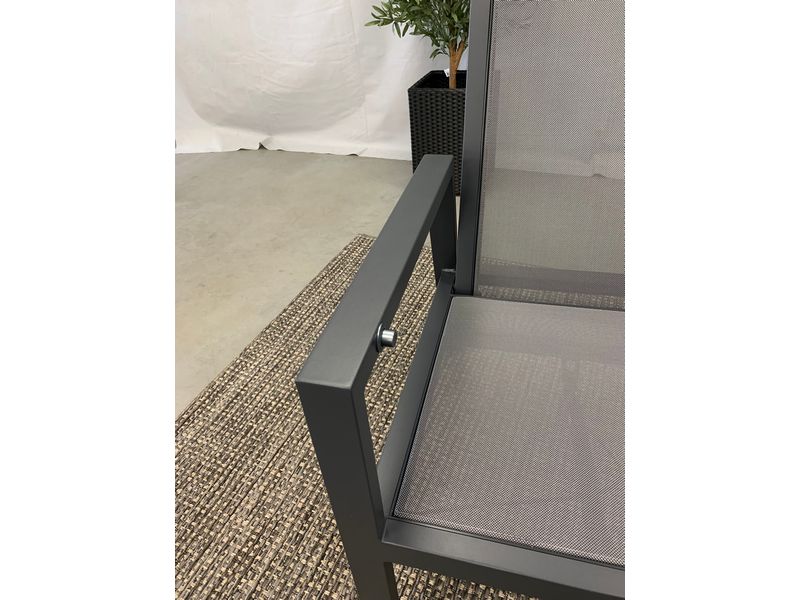 Deze prachtige tuinstoel is uitgevoerd in aluminium. De rugleuning is traploos verstelbaar. Het frame is van antraciet aluminum, met daartussen het kunststof textilene materiaal. De tuinstoel is zeer duurzaam, onderhoudsvrij en makkelijk schoon te houden. Het dikke kussen geeft een perfect zitcomfort, is gemaakt van een natuurlijk aanvoelend kunststof materiaal. Het kussen is duurzaam, vuil- en waterafstotend, en kleur echt.