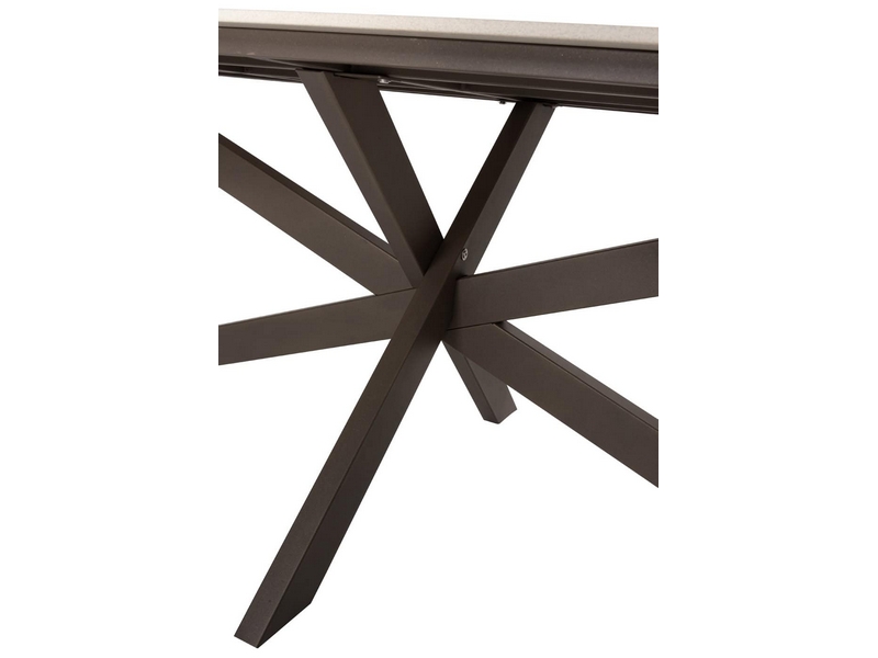 Het strakke kruispoot onderstel geeft deze tafel een eigentijdse en moderne uitstraling. Door het praktische kruispoot onderstel staan de stoelen vrij aan tafel zonder enige hinder van een tafelpoot. Het tafelblad van geprint keramiek bootst de luxe uitstraling van natuursteen na, terwijl het onderhoudsvriendelijk en krasbestendig blijft.