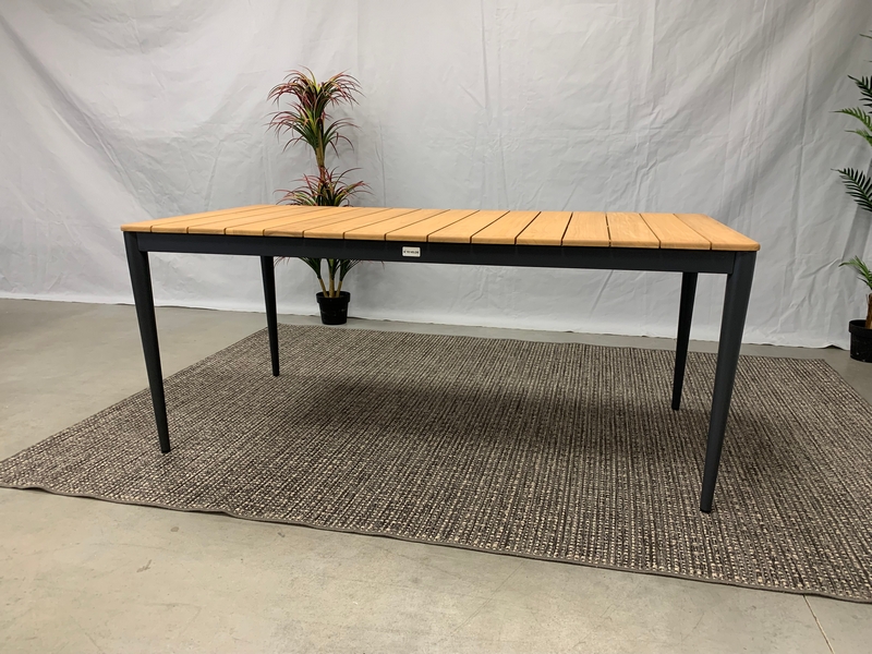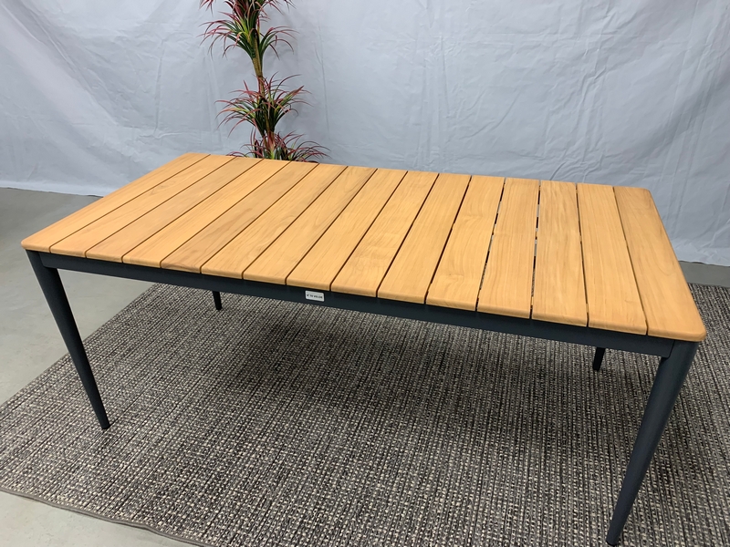 De Sandro teak-tuintafel heeft een Teak hout tafelblad en een aluminium frame dat een antraciet coating heeft. De tafel is 90 cm. breed, 1,8 meter lang en 0,75 meter hoog.