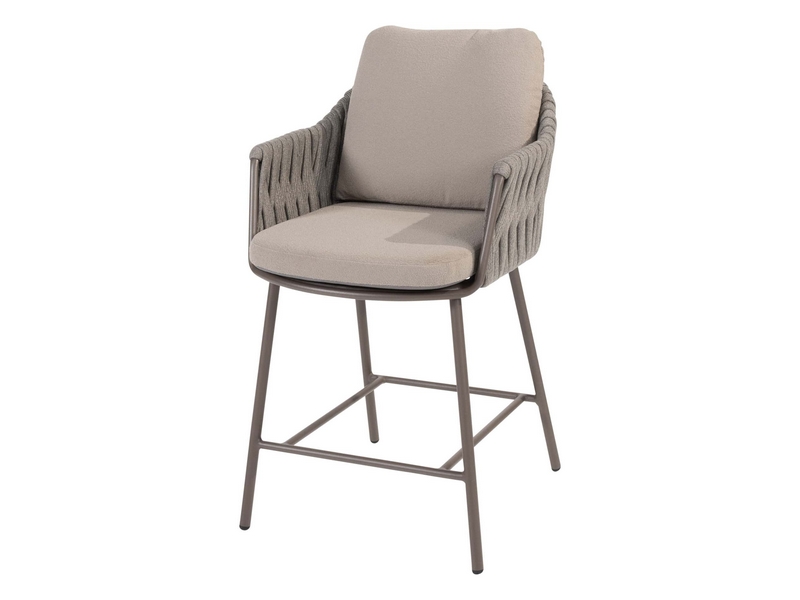 De Cannes stoel combineert een stevig gepoedercoat aluminium frame met prachtig handgevlochten rope. De royale zithoogte maakt deze stoel ideaal voor high dining tafels of buitenbars. Dankzij de meegeleverde all-weather kussens geniet je direct van comfort.