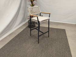 Mooi vormgegeven barstoel die bestaat uit een aluminium frame met een losse ztikussen. De stoel is bekleed met rope, een volledig kunststof draad welke weersbestendig, kleurecht en goed afwasbaar is. Deze Sandro barstoel is verkrijgbaar in de kleur antraciet, uitgevoerd met een lichte ropdraad. De bartafel Sandro heeft een aluminium onderstel, en een blad van teakhout. Deze bar-tuintafel heeft daardoor een natuurlijke uitstraling.