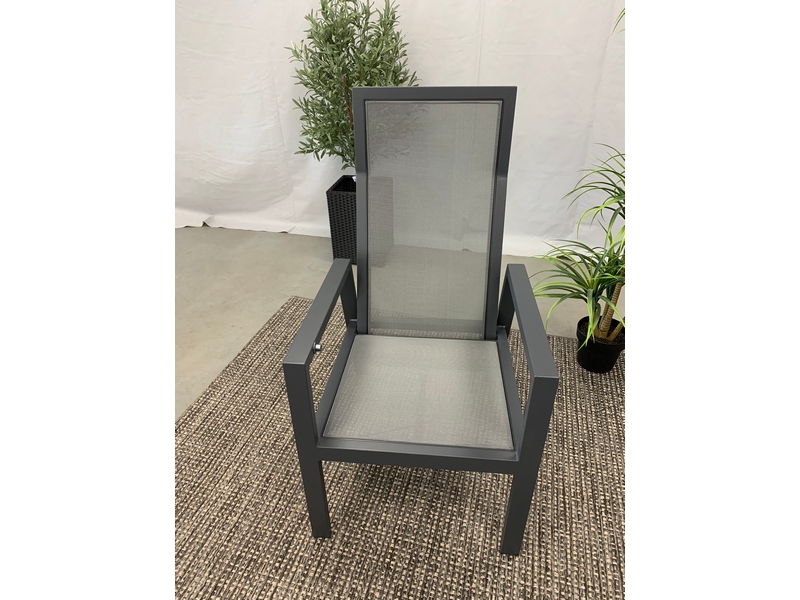 Deze prachtige tuinstoel is uitgevoerd in aluminium. De rugleuning is traploos verstelbaar. Het frame is van antraciet aluminum, met daartussen het kunststof textilene materiaal. De tuinstoel is zeer duurzaam, onderhoudsvrij en makkelijk schoon te houden. Het dikke kussen geeft een perfect zitcomfort, is gemaakt van een natuurlijk aanvoelend kunststof materiaal. Het kussen is duurzaam, vuil- en waterafstotend, en kleur echt.